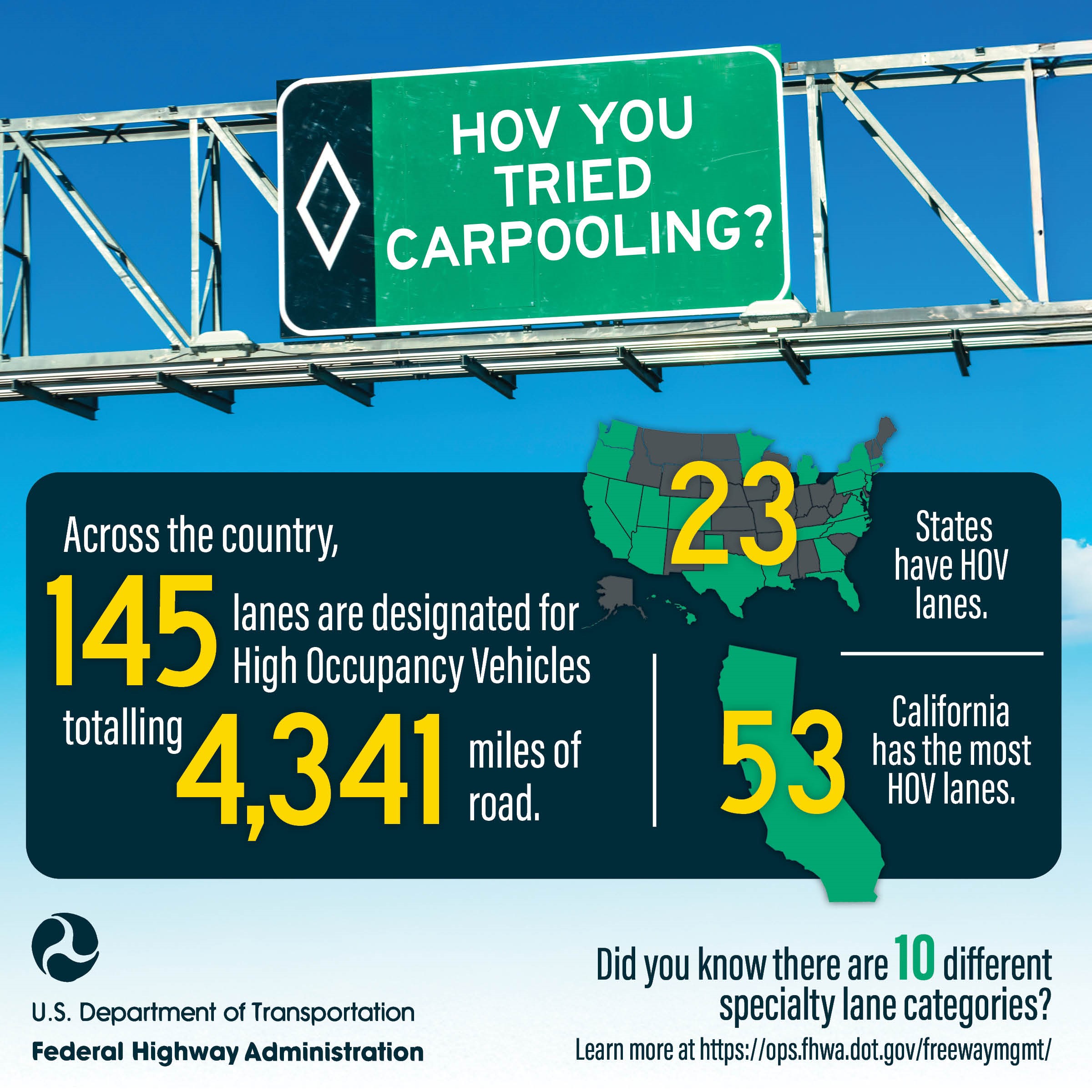 Only 23 states have HOV lanes. *HOV* you tried carpooling? The nation’s 4,341 miles of high-occupancy vehicle lanes are just 1 of 10 different categories of specialty lanes and highways that keep America moving. Want to learn more? Click here: https://ops.fhwa.dot.gov/freewaymgmt/