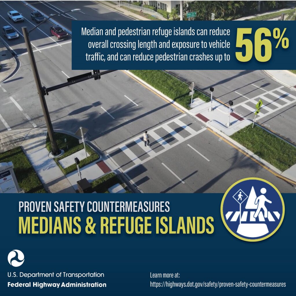 The use of medians and pedestrian-refuge islands is one of FHWA’s proven safety countermeasures that are making U.S. transportation safer for everyone. These medians and refuge island can help minimize both the distance that pedestrians need to travel to cross a road and their overall exposure to vehicle traffic, reducing pedestrian crashes by up to 56 percent! Learn more: Proven Safety Countermeasures | FHWA