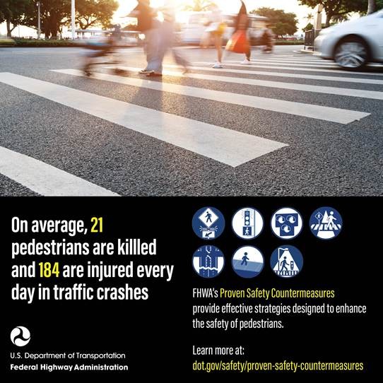 On average, 21 pedestrians are killed and 184 are injured every day in traffic crashes. Help make your roads safer for our pedestrians by incorporating FHWA’s proven safety countermeasures in your road construction projects: https://highways.dot.gov/…/proven-safety-countermeasures