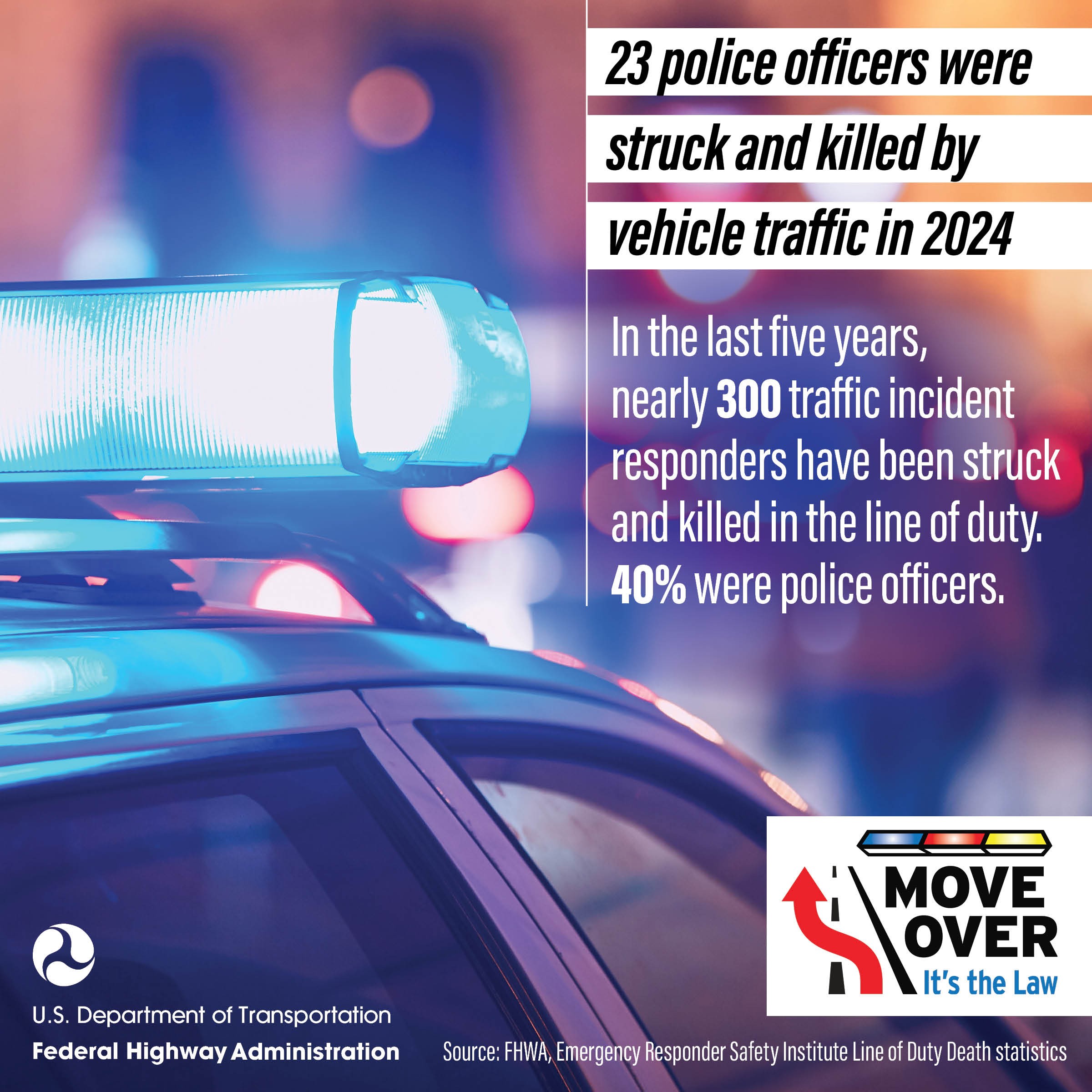 It’s the law! We must move over for our law enforcement officers before, during, and after this National Police Week. Police officers make up 40 percent of all traffic incident responders who have been struck and killed in the last five years. #NationalPoliceWeek #PoliceWeek2025