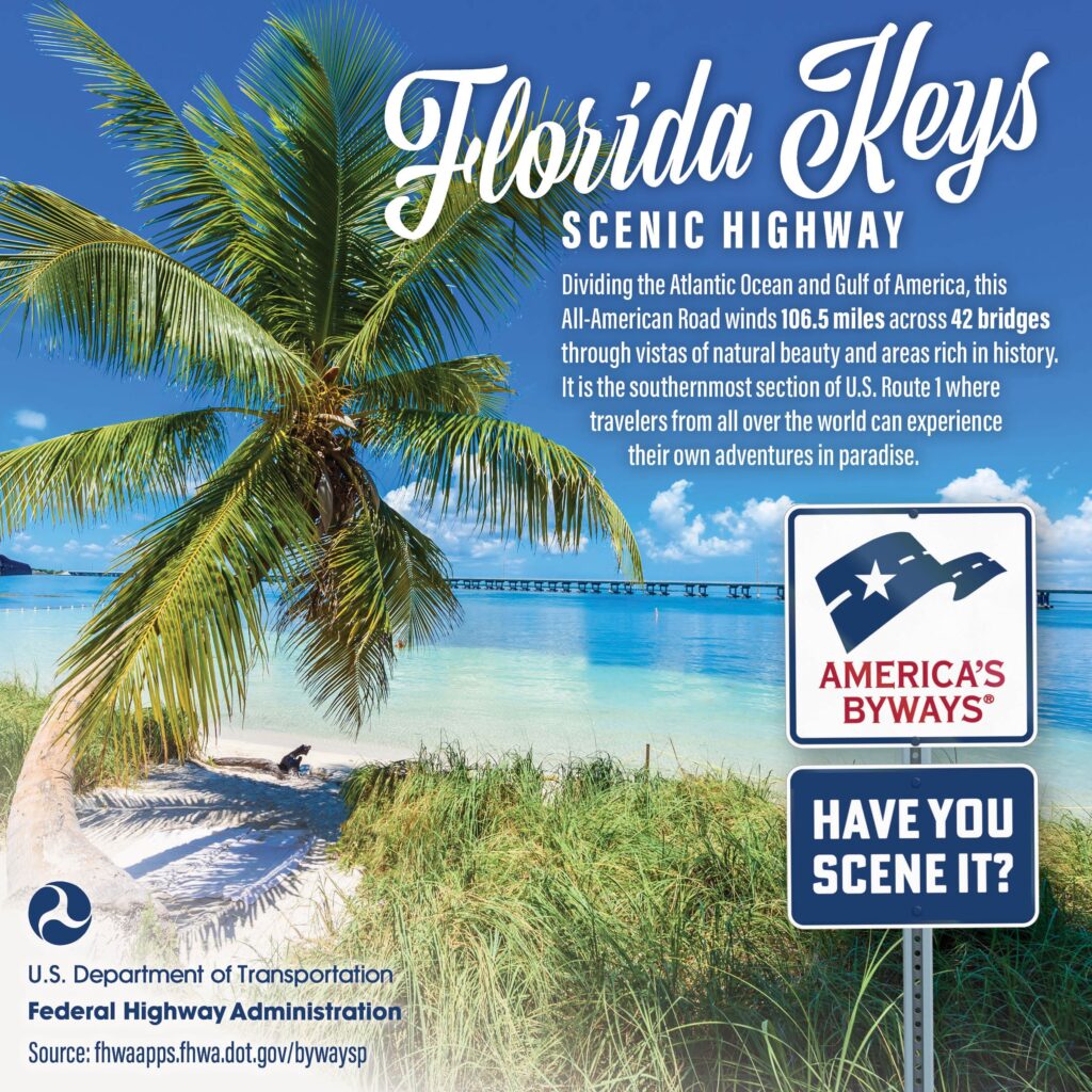 Have you SCENE it? Planning a #GreatAmericanRoadTrip this summer? Florida Keys scenic highway, the southernmost section of U.S. Route 1, winds 106.5 miles across 42 bridges with the Atlantic Ocean on one side and the Gulf of America on the other! https://fhwaapps.fhwa.dot.gov/bywaysp #TheGreatAmericanRoadTrip #ToSeeAmericaIsToLoveAmerica #America250 #SeeYouOnTheRoad