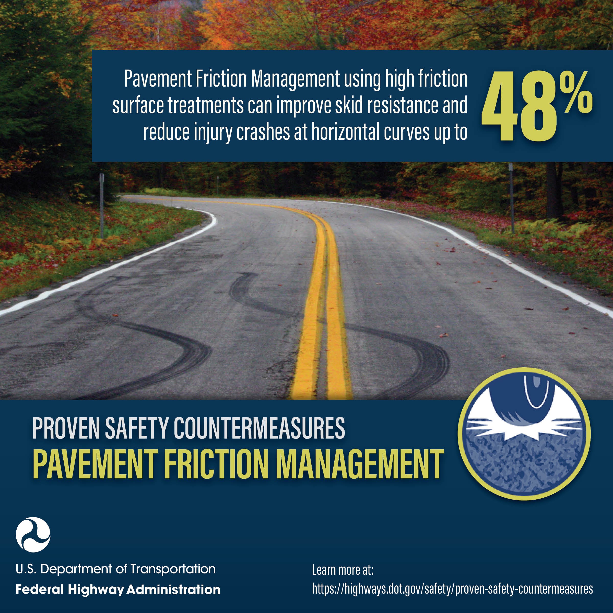 FHWA’s proven safety countermeasures save lives! High friction surface treatments can improve skid resistance and reduce injury crashes at horizontal curves up to 48%! More info on FHWA’s countermeasures: https://highways.dot.gov/…/proven-safety-countermeasures