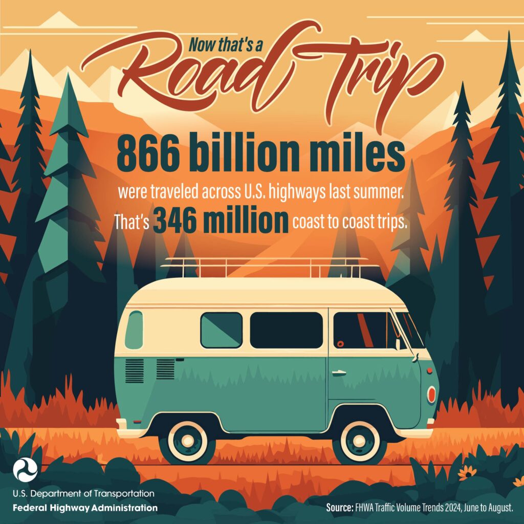 Ready for a trippy fact? Last year, American highways supported more than 866 billion miles of travel! That’s the equivalent of 346 million coast-to-coast trips! Talk about being road-trip ready! Don’t let safety trip you up on your #TheGreatAmericanRoadTrip—stay alert, put away distractions (including your phone!), and enjoy the drive. #America250 #SeeYouOnTheRoad